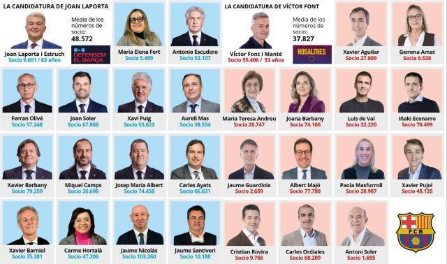 挑战者中,除了2021年曾斩获近30%选票的丰特之外,还有比拉华纳与马克·西里亚。前者是巴托梅乌董事会中分管青训的董事,被视作近几个赛季青训球员涌现背后的关键人物;后者则是经济学家,曾是拉波尔塔2015年参选时团队的一员。三人一度密切商讨联合参选的可能性,但最终因西里亚不满比拉华纳的巴托梅乌背景而告吹。然而签名时间截止后,三人中只有丰特闯关成功,他获得了5144份签名,超过了2021年的4713份。比拉华纳仅获得1593份签名,而西里亚虽提交了2844份签名,但经过核验后仅有2247份有效,低于2337份(即会员大会人数半数)的门槛。